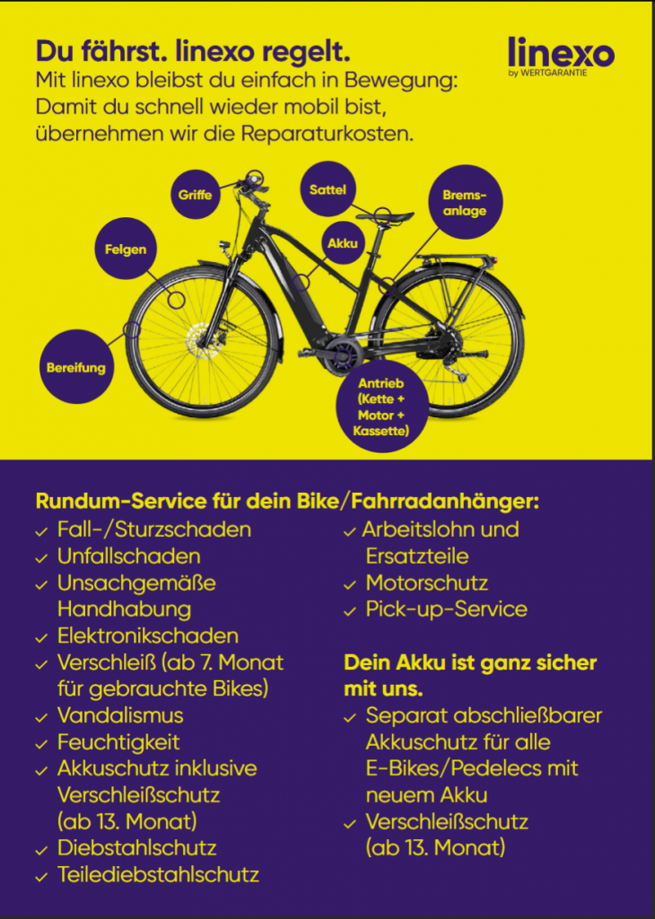 Mit dem linexo Komplettschutz Bike bist du auch im Schadensfall bestens abgesichert. Ob Defekt, Panne oder Schaden: Komm einfach zu uns – unser Partner linexo übernimmt die Abwicklung, du holst dein Bike repariert wieder ab und fährst weiter.